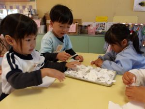 「鏡餅は白くて丸くて…みかんもあるよね!」と互いに意見を言い合いながら制作をしました!![]()