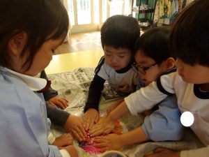 友達と一緒に好きな色を選んだ後は…ラップの上から指を使って、絵の具が広がる感覚を楽しみました!