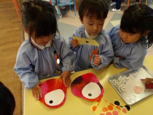 『だるま』の顔は、目を貼る係やほっぺを貼る係などそれぞれ役割に分かれて好きな場所にシールを貼り、素敵なだるまが完成![]()
