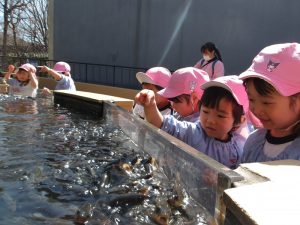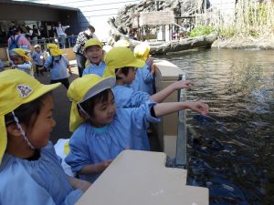 一番楽しみにしていたエサやり体験では、一斉に大きな口を開けて水から顔を出す魚の大群に、