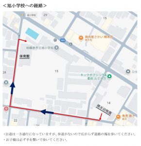 ・10時に園庭に集合し、来場者全員で旭小学校に向かいます。(ベビーカーでお越しの方は、園のベビーカー置き場に置いてから旭小学校へ移動してください。)