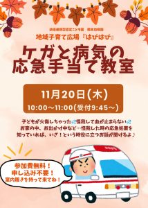 11月の地域開放子育て広場『はぴはぴ』の講座では、北消防署の方をお招きして、「けがと病気の応急手当について」お話ししていただきます